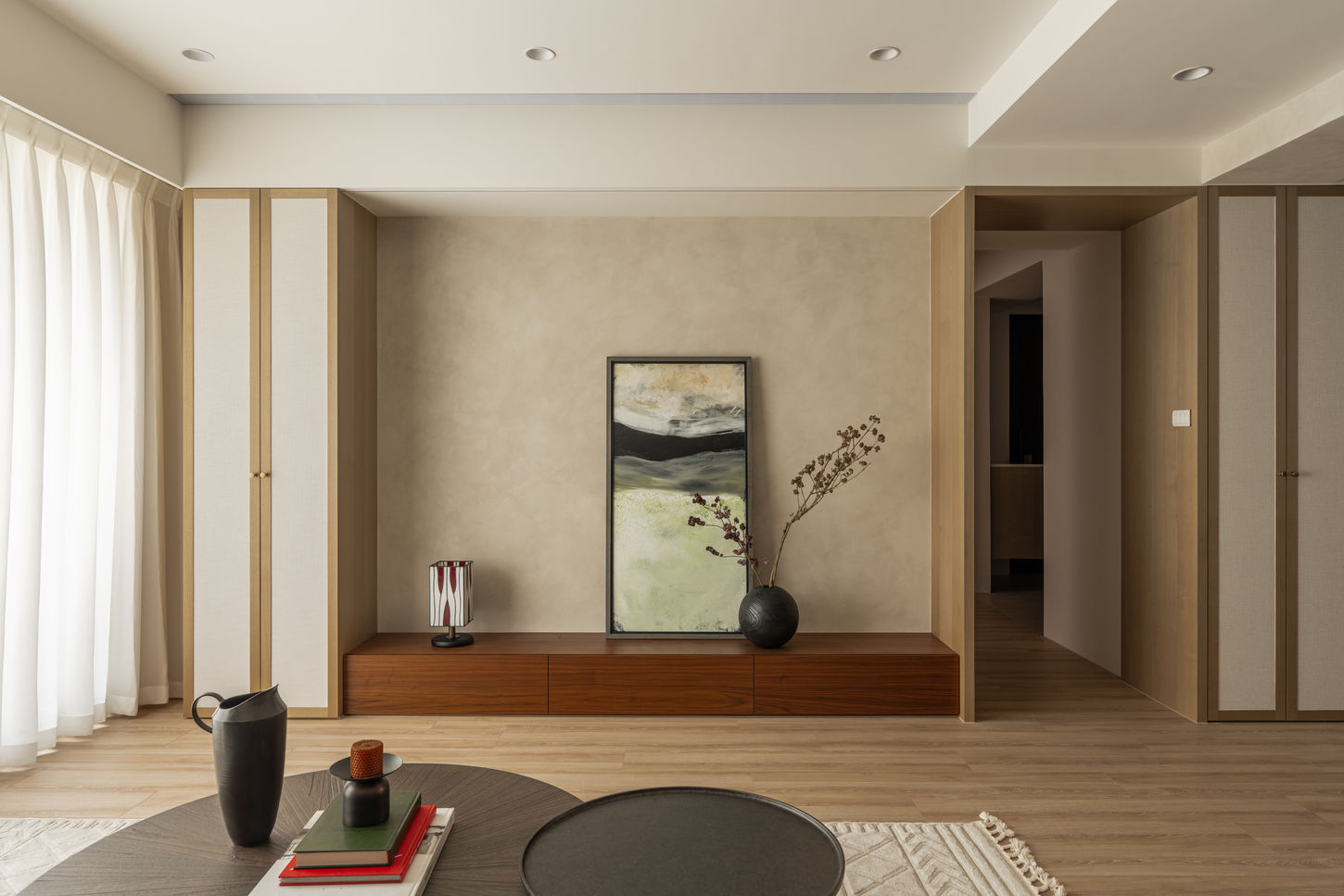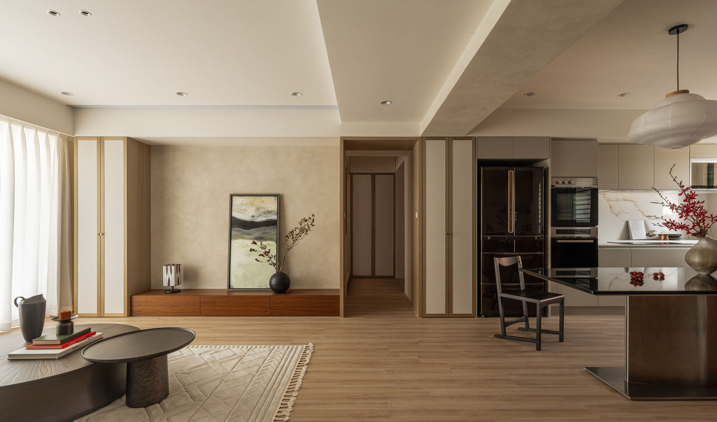 優異的原始格局,使整體配置得以保持流動性與清爽度,生活動線自然地穿梭其中。公共領域以一筆矩形順勢串聯,延伸出開闊的空間感,形塑出全室的核心骨架,使客廳與餐廳既緊密連結、又彼此不受干擾。視線與光線得以自由流動,沒有刻意的阻隔,也沒有多餘的形體,讓生活的本質回到「空間本身的舒適與自在」。其餘生活空間則沿著這條骨架展開,以最小化的廊道連接,讓每個區域自然融入整體節奏。