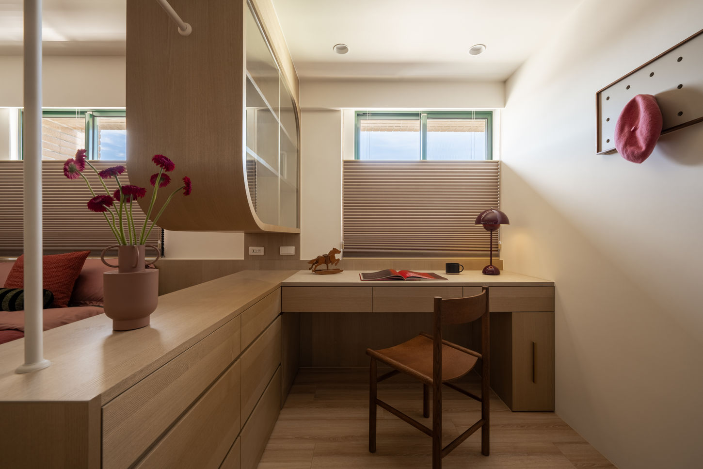 材質上以水染木與胡桃木作為主體,透過深淺木色的層次對話,呈現懷舊韻味與現代美學之間的微妙平衡。搭配簡約北歐家具,增添輕盈與生活感,使整體氛圍在柔和與沉穩間取得恰到好處的和諧。而軟裝上跳脫同色調路線,我們以紫紅與墨綠色系作為點綴──讓色彩在木質基底中悄悄綻放,在衝突與交融之中,時間的痕跡與質材的溫度緩緩堆疊,凝結成這間老屋的全新篇章。